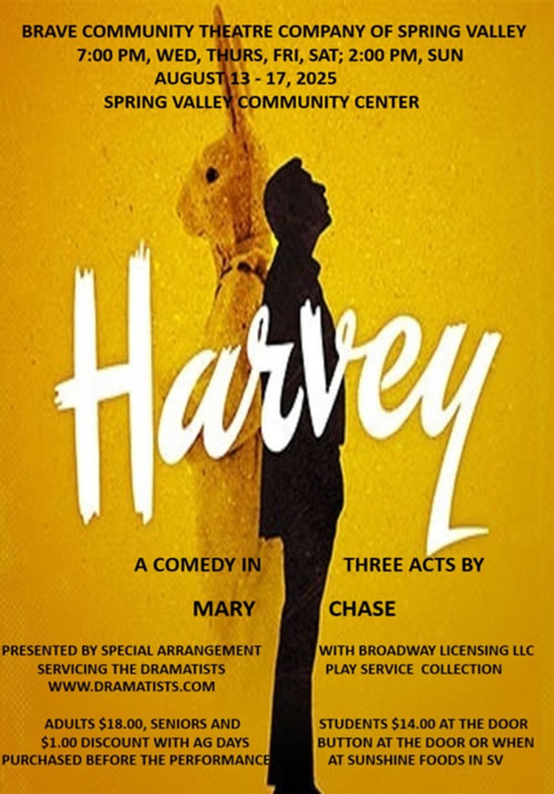 Brave Community Theatre Presents: Harvey August 13th- 7pm August 14th- 7pm August 15th- 7pm August 16th- 7pm August 17th- 2pm + Add to Google Calendar + iCal / Outlook export Date Aug 13 - 17 2025 Expired! Time All Day Share this event